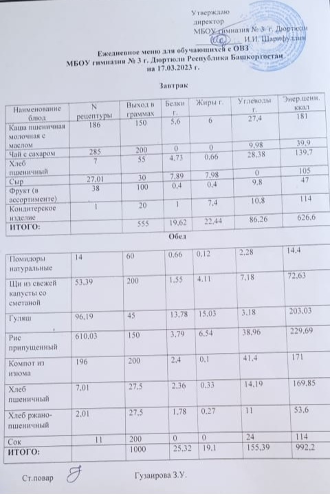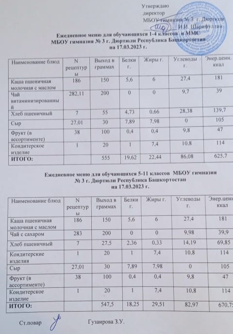 Меню на 17.03.2023 для 1-4 и 5- 11 кл