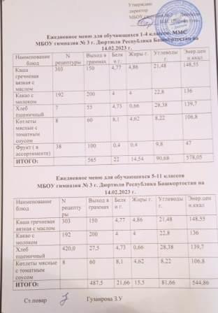 Меню на 14.02.2023 для 1-4 и 5-11 кл