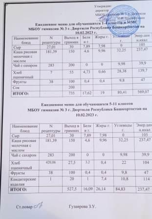 Меню на 10.02.2023 для 1-4 и 5-11 кл