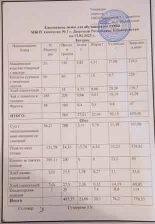 Меню на 13.02.2023 для 1-4 и 5-11 кл
