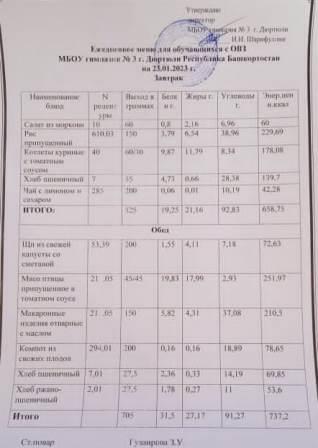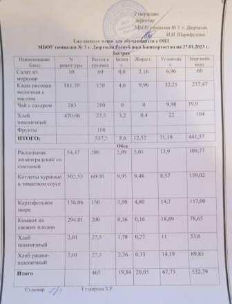 Меню на 23.01.2023 для ОВЗ