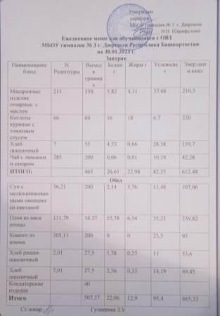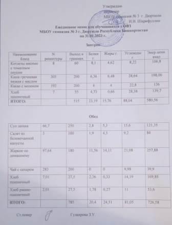 Меню на 31.01.2023 для ОВЗ