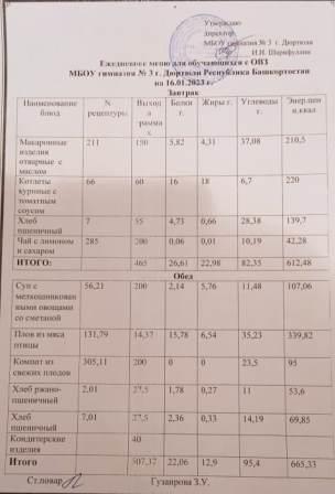 Меню на 16.01.2023 для ОВЗ