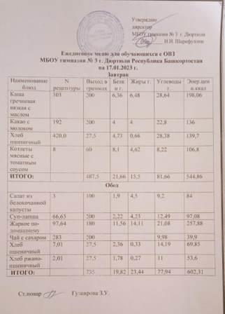 Меню на 17.01.2023 для ОВЗ