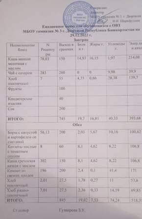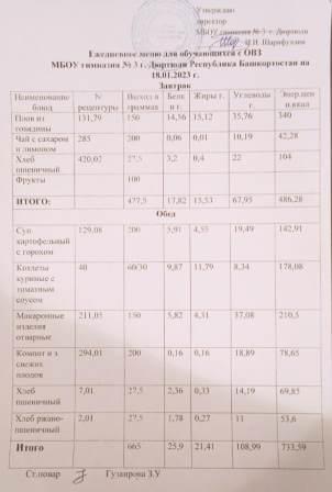 Меню на 18.01.2023 для ОВЗ