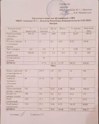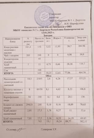 Меню на 12.01.2023 для овз