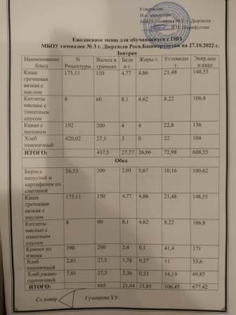 Меню на 7.11.2022 для ОВЗ