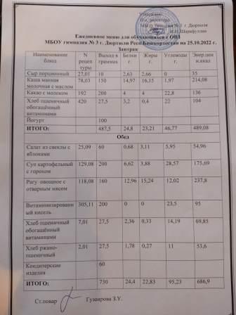 Меню на 25.10.2022 для ОВЗ