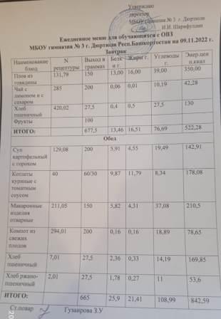 Меню на 09.11.2022 для ОВЗ