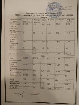 Меню на 26.10.2022 для ОВЗ