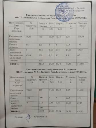 Меню на 27.09.2022 для 1-4 и 5-11 кл