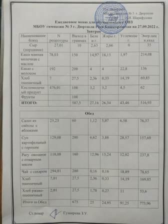 Меню на 27.09.2022 для ОВЗ