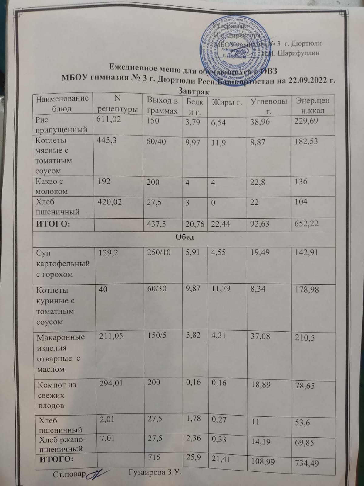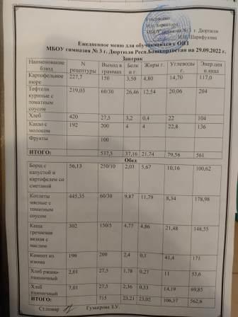 Меню на 22.09.2022 для ОВЗ