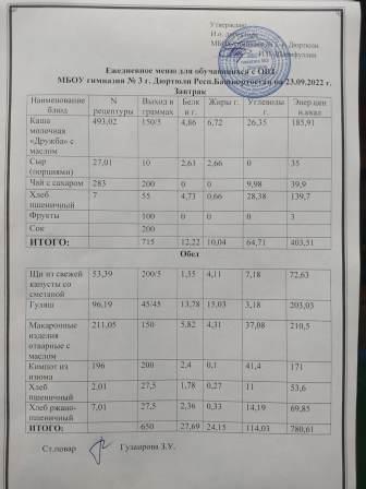 Меню на 3.10.2022 для ОВЗ