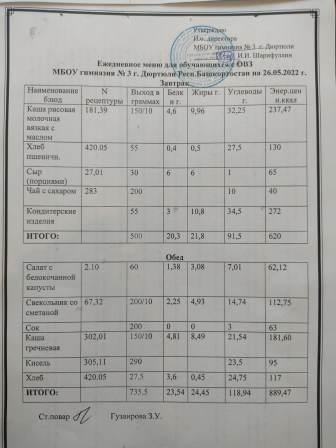Меню на 26.05.2022 для ОВЗ