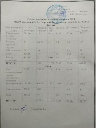 Меню на 23.05.2022 для ОВЗ