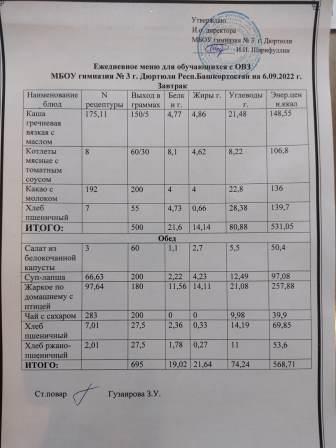 Меню на 06.09.2022 для ОВЗ