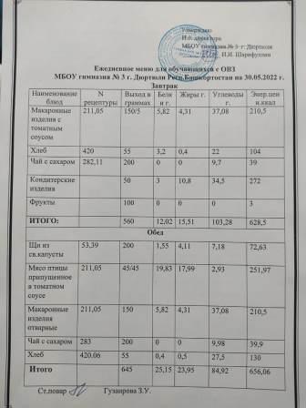 Меню на 30.05.2022 для ОВЗ