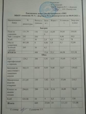 Меню на 09.09.2021 для ОВЗ