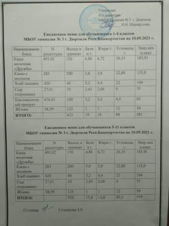 Меню на 10.09.2021 для 1-4 и 5-11 кл