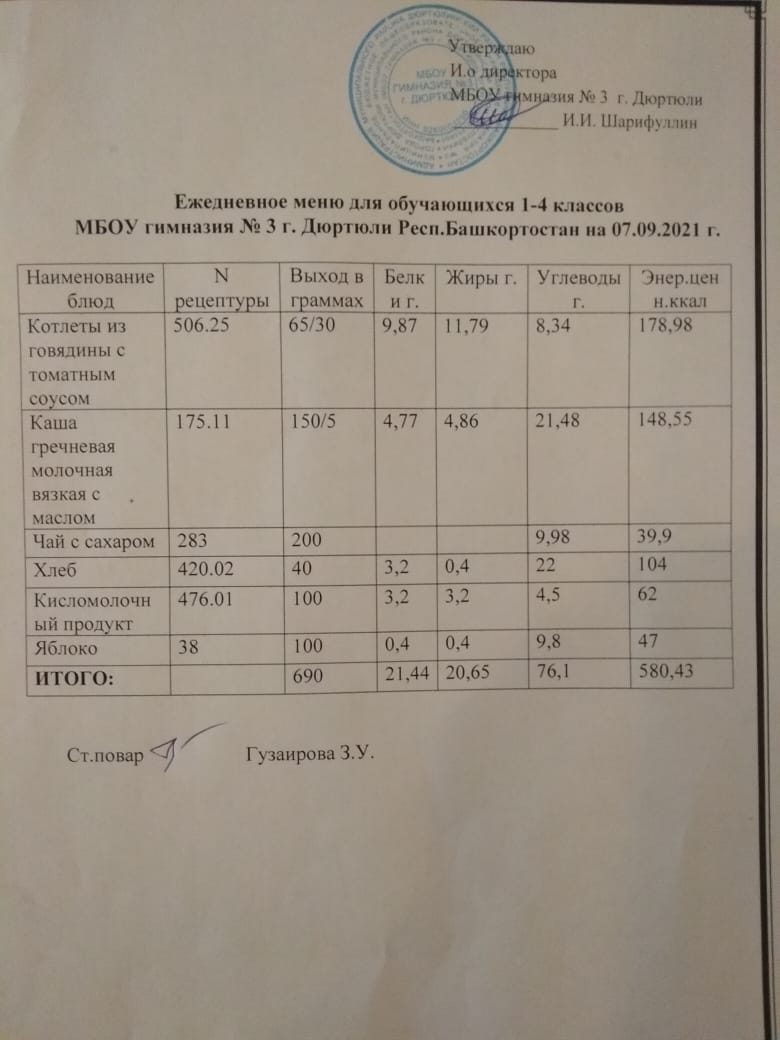 Меню на 07.09.2021 для 1-4