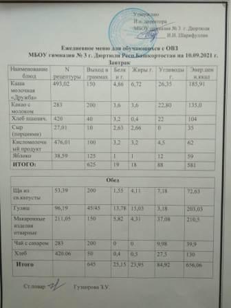 Меню на 10.09.2021 для ОВЗ